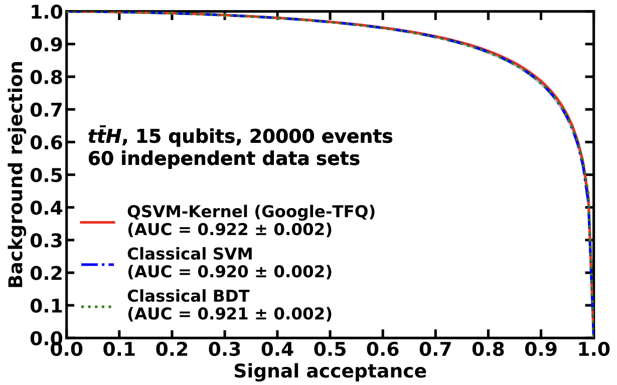 Figure 4: Overlay of the Receiver Operating Characteristic from the QSVM-kernel algorithm, the classical SVM, and the classical BDT classifiers evaluated on 20000 $t\bar{t}H$ events.